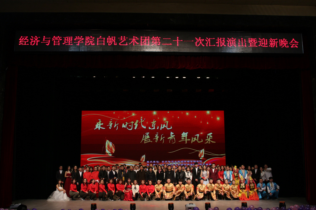 1998年10月,经济与管理学院白帆艺术团成功举办了办团以来的第一次文艺汇演,至今已成功举办了21次专场汇报演出。作为学生群众性社团组织,白帆艺术团自成立之日起就以“服务青年学生成长成才”为办团初心,以打造“高雅文化”为办团宗旨,力求推出精品力作,有序实现文化育人。近年来,白帆艺术团全体成员坚持“不忘办团初心、青春携手奋进”的办团理念,积极活跃在校、院两级的文化舞台上。低俗不等于通俗、通俗不等于高雅,单纯感官上的娱乐不等于精神上的真正快乐。近年来,经济与管理学院白帆艺术团深入贯彻全国全省高校思想政治工作会议精神,坚持“以文化人、以文育人”,将满足青年学生群体的崇高精神文化需求作为作品创作的出发点,坚持以“高雅文化”引领青年学生成长成才,将中华优秀传统文化、革命文化、社会主义先进文化等元素融入节目创作,充分发挥了高雅文化的育人功能,在服务青年学生成长成才方面做出了重要贡献。