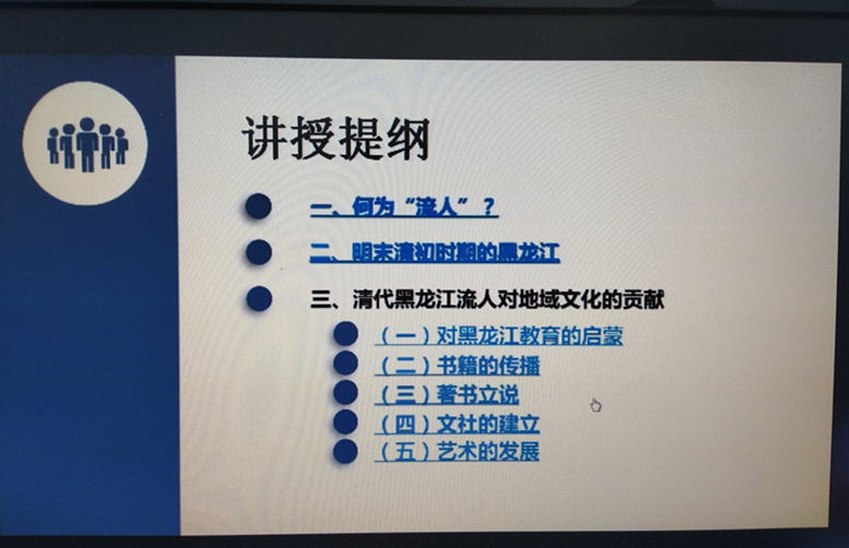 《索引钩沉话“流人”——清代黑龙江流人对地域文化的贡献》课程主要包含三个方面内容,一是流人的界定。二是明末清初时期的黑龙江。三是清代黑龙江流人对地域文化的贡献。