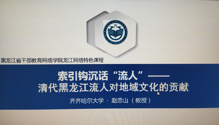 赵忠山教授旁征博引、索引钩沉,从清代黑龙江流人对地域教育的启蒙 、书籍的传播、著书立说、文社的建立、艺术的发展、宗教信仰的改变等诸多方面进行了精彩的讲授,课程讲授生动流畅、图文并茂、据经用典、精彩纷呈、体现了齐大学者的风范。课程深入浅出地阐述了黑龙江文化的渊源和流人启蒙的重大意义,为黑龙江文化的研究具有重要参考与借鉴意义。正像课程结束语说的那样:“黑龙江是满清皇室龙兴之地,满清时期经济文化相当落后,被称之为蛮荒绝塞之地。这里居住着满族、达斡尔、赫哲等众多少数民族,他们对中原文化不了解,清代黑龙江文化流人的到来,传播了中原文化与文明,启蒙并推动了黑龙江地域文化的发展和繁荣!”
