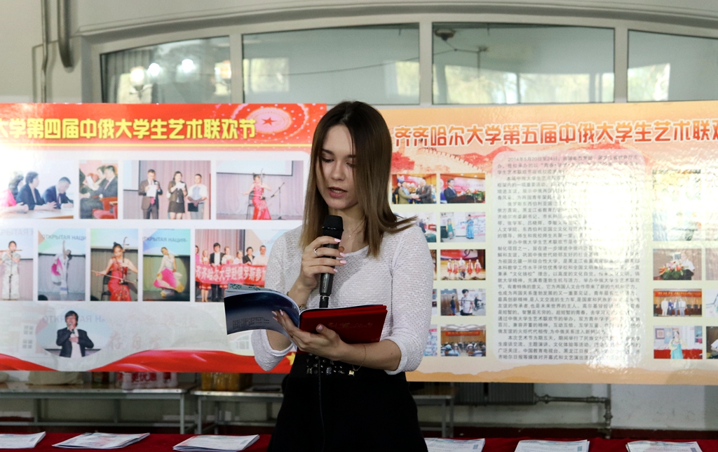 张树军在活动中致辞,他指出,齐齐哈尔大学作为教育部“中俄大学生艺术交流基地”和黑龙江省西部地区最大的综合性大学,始终坚持“文化铸校”的办学理念和“文化传承与创新”的大学职责,充分发挥教育资源特色和人文地理优势,在国际教育合作和文化交流方面取得了一系列成绩,已成功举办九届中俄大学生艺术联欢节,为两国青年相互学习、相互交流提供了重要的交流平台。此次中俄联欢艺术节“我们走过的十年”征文活动寄托着中俄青年手牵手、心连心,共同延续中俄关系世代友好的期盼。希望通过彼此交流、相互学习能促进双方对文化艺术产生全新认识,从而打造更加开放、多元的艺术生态。