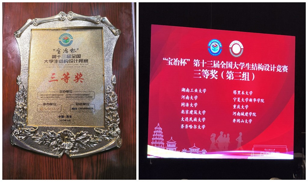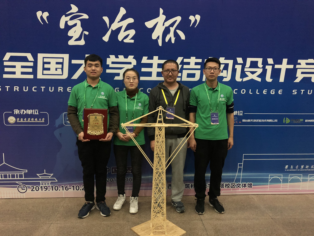 10月20日下午,历时5天的2019年“宝冶杯”第十三届全国大学生结构设计竞赛在西安建筑科技大学体育馆圆满落幕。来自110所高校的111支参赛队围绕“山地输电塔模型设计与制作”进行现场比拼。由我校建筑与土木工程学院土木工程系2016级本科生赵丽娟、景云雷和2017级本科生王爽组成的齐齐哈尔大学代表队在指导教师张宇、王丽的悉心指导下,经过紧张激烈地角逐,荣获全国三等奖,取得我校在此项赛事上的历史性突破。