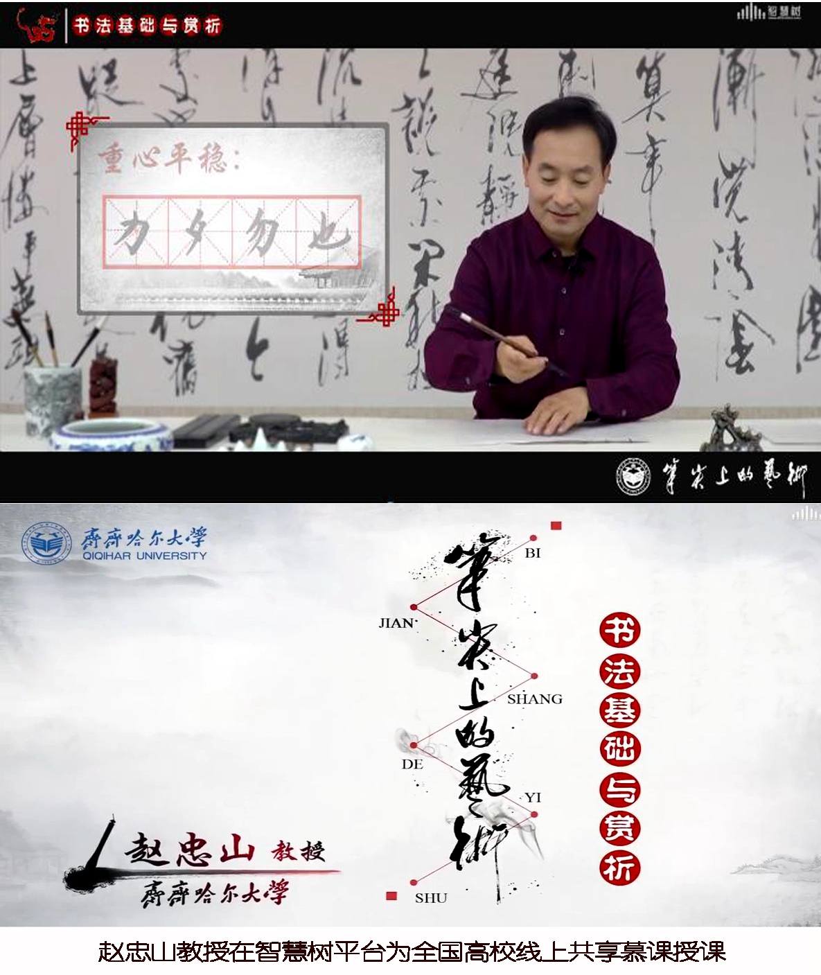 赵忠山教授还发挥自己在艺术方面的特长,先后开设了《书法基础与赏析》、《硬笔书法》等公共选课,《书法研究》、《教师三笔字书写技能》等专业选修课,《板书设计》、《书写技能》、《粉笔字技巧》等青年教师培训等课程。他策划并主讲的省级精品在线慕课(MOOC)《书法基础与赏析》开课3个学期,获得全国各高校的赞誉,截止到目前已有78所高校选用,选课学生13200余名,师生互动达2.05万次。为我校赢得了广泛的社会赞誉,扩大了学校的影响力。