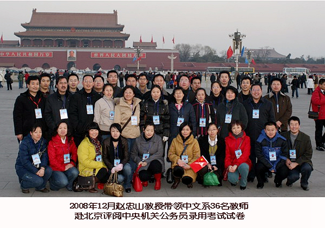 内强素质的同时还要外树形象,2007年12月12日,应国家人力资源部邀请,他带领36名中文系教师赴京评阅2008年中央机关公务员考试试卷,赢得了原国家人事部、各兄弟院校、兄弟单位的一致好评,为齐齐哈尔大学、齐齐哈尔市,乃至黑龙江省争得了荣誉。2008年,赵忠山教授紧紧抓住庆祝中文系建系五十周年的契机,广泛邀请社会各届人士参与其中,广泛联系毕业生中有一定影响的学生积极为系庆作贡献。2008年7月15日,在校领导的大力支持下,中文系成功举办建系五十年庆典活动,产生了良好的社会反响。多年来,中文系为我校教评创优和创建省属重点大学贡献了力量,多次获省、市、校的表彰和奖励,被《光明日报》、《中国教育报》、《齐齐哈尔日报》等各大媒体热忱报道。