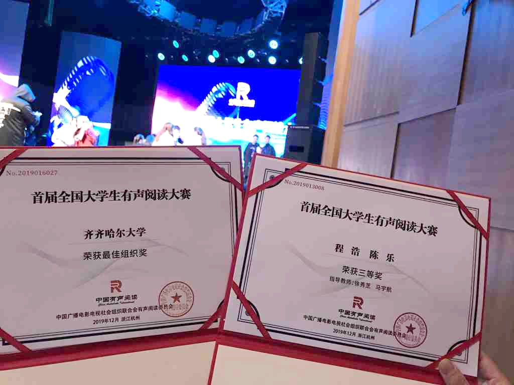由我校文学与历史文化学院(新闻传播学院)播音与主持艺术专业17级陈乐、18级程浩两位同学组成的参赛团队,通过参赛作品《神农尝百草》获得首届全国高校有声阅读大赛决赛资格并荣获总决赛三等奖,徐秀芝、马宇航两位老师荣获优秀指导教师奖,齐齐哈尔大学荣获最佳组织奖。