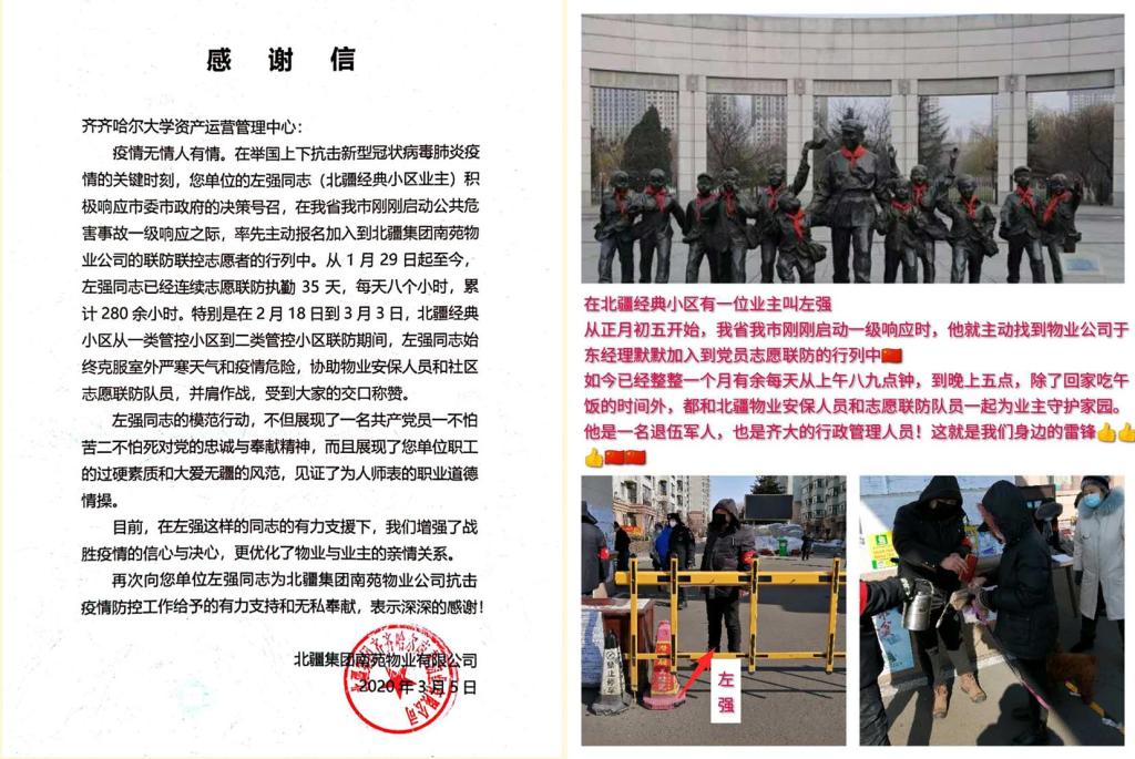 北疆集团南苑物业有限公司在感谢信中表示,左强同志的模范行动,不但展现了一名共产党员一不怕苦二不怕死精神以及对党的忠诚与奉献精神,而且展现了齐齐哈尔大学职工的过硬素质和大爱无疆的风范,见证了为人师表的职业道德情操。