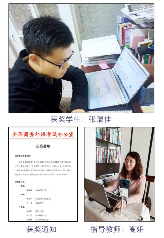 据指导老师高妍副教授介绍,早在2020年1月,外国语学院就派出了7名同学参加了该赛事黑龙江赛区的笔译和口译复赛,并全部获奖。这次口译大区赛共有来自黑龙江省、吉林省、辽宁省和内蒙古自治区的11所高校参赛。我校学生张瑞佳与东北师范大学、哈尔滨师范大学等高校的学生同台竞技,斩获了唯一的一等奖。这次获奖代表着我校英语专业应用型建设取得了可喜的成果,更体现出我校学生在疫情防控期间积极向上的精神风貌。