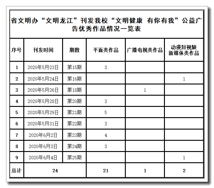 截至近日统计,我校有24项作品入选省文明办“文明健康 有你有我”公益广告优秀作品征集活动,涵盖平面类作品21件、广播电视类作品1件、动漫短视频新媒体类作品2件,被黑龙江文明网、“文明龙江”微信公众号推介9期,向社会广泛宣传推广,产生了积极而广泛的社会反响,进一步提升了我校的知名度和美誉度,发挥了全国文明单位的示范、辐射和引领作用。