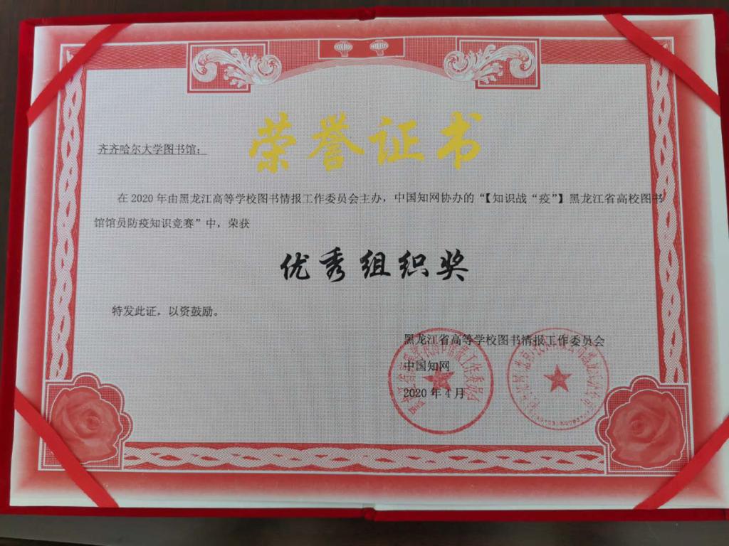 我馆积极组织员工参与竞赛活动,经过一个月的激烈角逐,我馆两位老师获得一等奖,12位老师获得二等奖,齐齐哈尔大学被评为最佳组织奖,取得了可喜成绩。