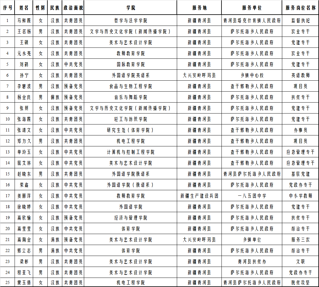 志愿西部行,奉献新时代。我校2020年大学生志愿服务西部计划志愿者招募工作自5月份启动以来,各学院和相关部门广泛宣传、协调配合,美丽的环湖大学唱响“到西部去,到基层去,到祖国最需要的地方去”建功立业的青春旋律。按照黑龙江省项目办工作指示,结合我校的具体情况,经过学校西部计划项目办初审、线上限时笔试、体检等程序综合考量后。最终25名毕业生在153位报名者中脱颖而出,被正式确定为齐齐哈尔大学2020年大学生志愿服务西部计划志愿者,他们将分赴黑龙江大兴安岭地区、新疆阿勒泰地区进行基层青年工作、基础教育、基层社会管理等类型的志愿服务。