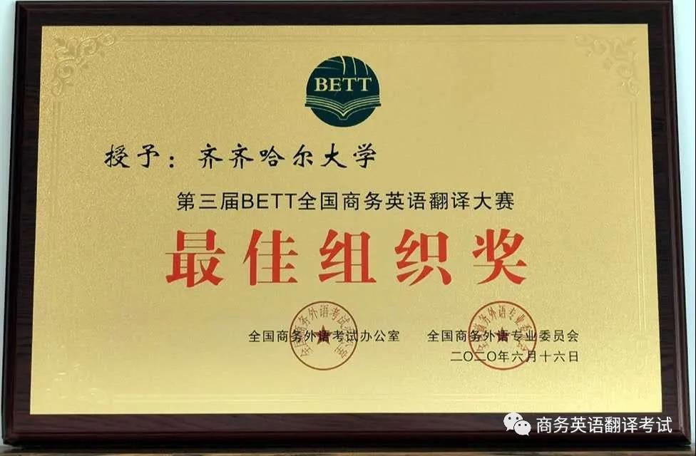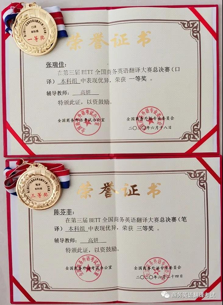 6月20日,第三届BETT全国商务英语翻译大赛总决赛圆满落幕,我校学子喜获佳绩。外国语学院英语专业张瑞佳同学荣获口译本科组总决赛一等奖,陈芬菲同学荣获笔译本科组总决赛三等奖,我校由于赛事组织表现出色获得“最佳组织奖”。
