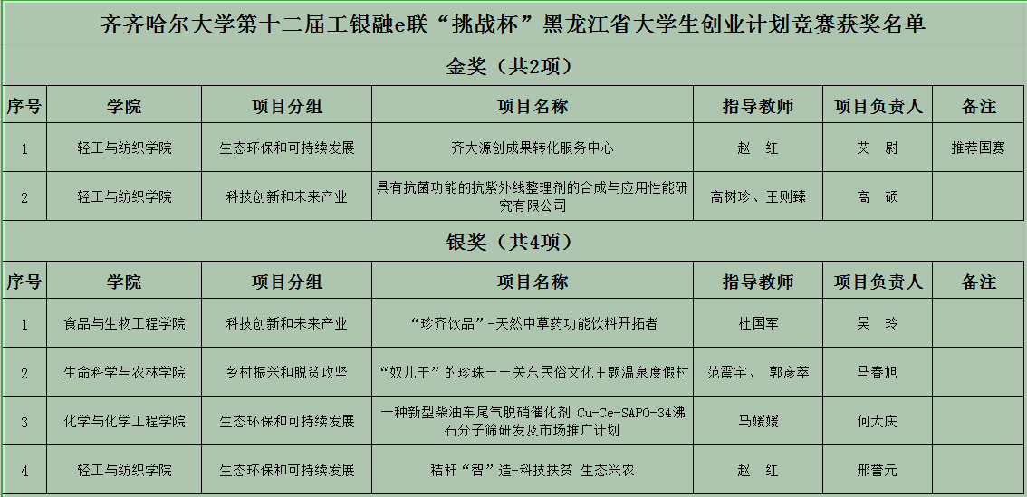 8月23日,由团省委、省教育厅、省科协、省学联联合主办的第十二届工银融e联“挑战杯”黑龙江省大学生创业计划竞赛终审决赛在哈尔滨工程大学启航活动中心隆重举行,全省35所高校选送的209件创业项目作品参赛。8月31日,竞赛结果公布,我校有13项作品获奖,其中金奖2项、银奖4项、铜奖7项,金奖作品中有1项入围国赛。