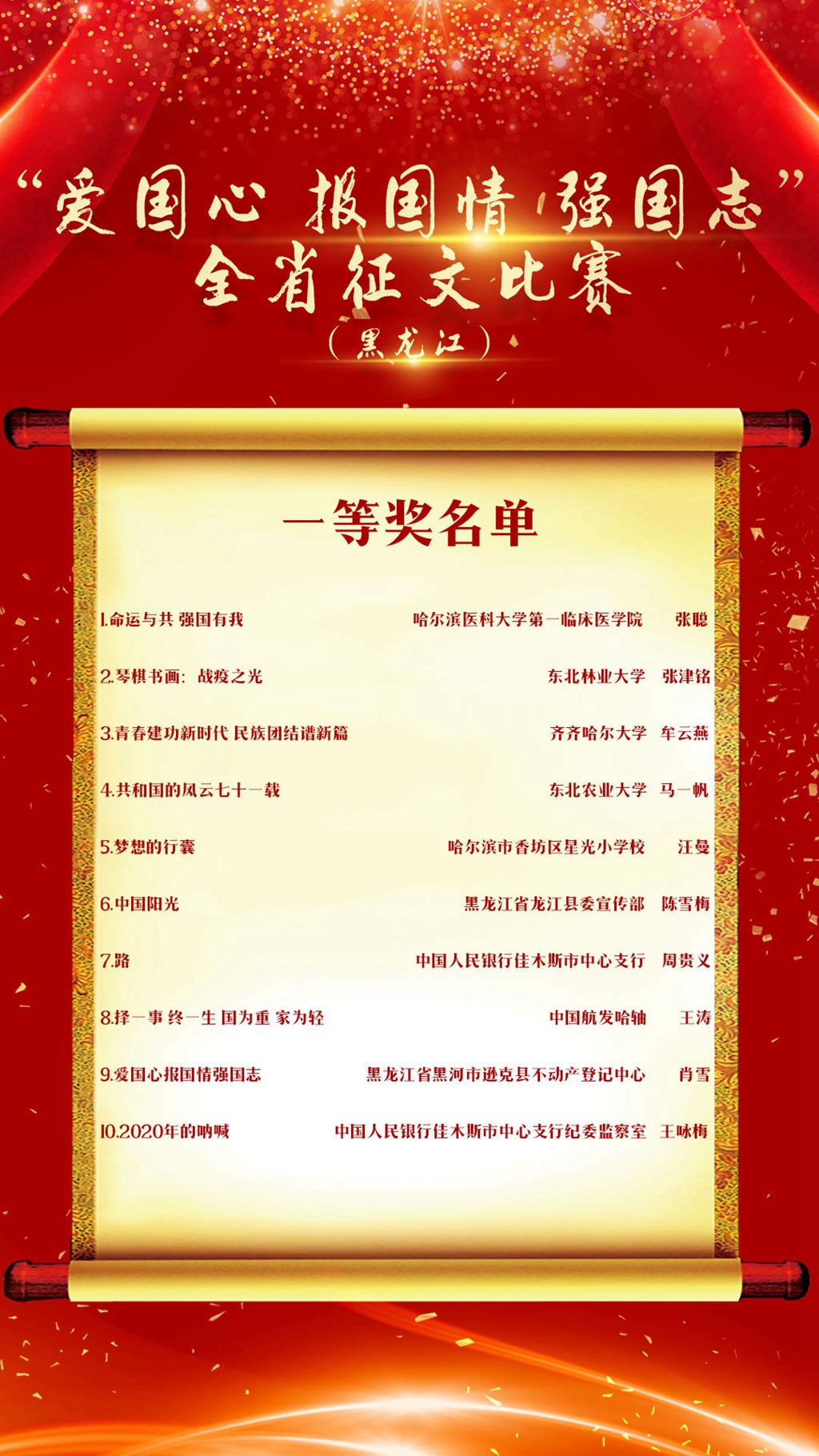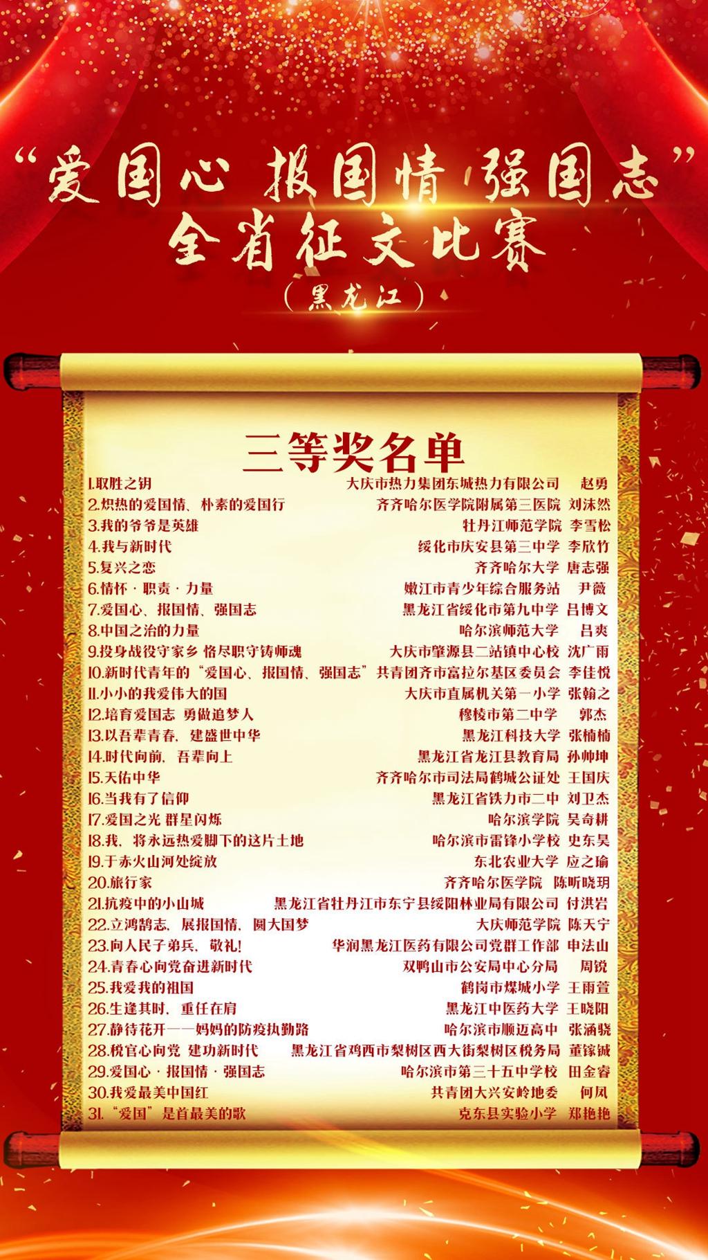 为深入贯彻落实习近平新时代中国特色社会主义思想,深化爱国主义教育,促进青少年健康成长,培养担当民族复兴大任的时代新人,“学习强国”学习平台开展了以“爱国心·报国情·强国志”为主题的征文活动。11月12日,“学习强国”黑龙江学习平台发布了征文活动获奖名单,我校遴选推荐的两篇原创作品在全省征文活动中分获一等奖和三等奖,在全省高校名列前茅。