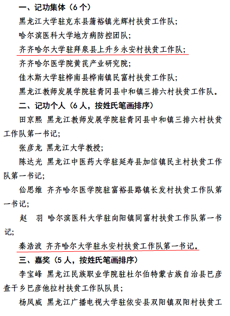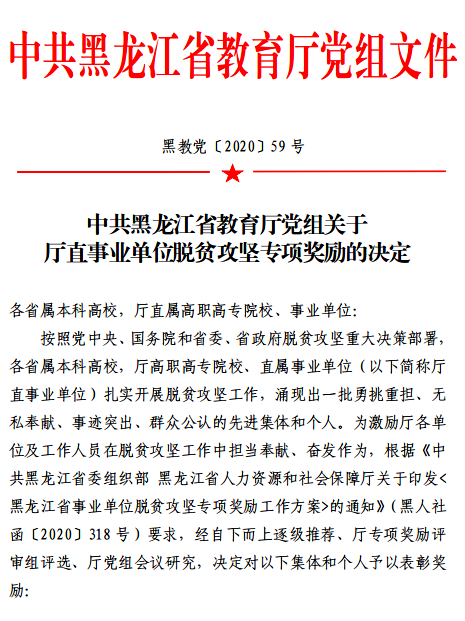 为激励驻村工作人员在脱贫攻坚工作中担当奉献、奋发作为,根据《中共黑龙江省委组织部黑龙江省人力资源和社会保障厅关于印发<黑龙江省事业单位脱贫攻坚专项奖励工作方案>的通知》(黑人社函〔2020〕318号)要求,12月14日,省教育厅党组印发了《中共黑龙江省教育厅党组关于厅直事业单位脱贫攻坚专项奖励的决定》(黑教党〔2020〕59号),我校驻拜泉县上升乡永安村扶贫工作队荣获记功集体,我校驻永安村扶贫工作队第一书记秦浩波同志荣获记功个人。