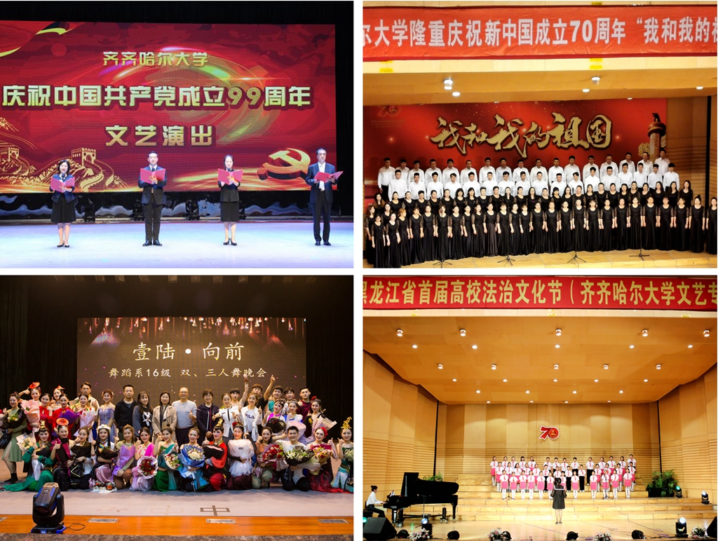 “问渠哪得清如许,唯有源头活水来”,思政元素是人才培养的源头活水,为传统教学注入了新能量,在授课中起到了画龙点睛的作用,让教师“授业、解惑”的同时更强调了“传道”,将立德树人做深做实。在《声乐》课程的教学中,分年级、分难度、分时段系统性地选择有代表性的“红色经典”歌曲加入教学计划并精心设计,结合歌曲创作背景分析、学生表演的二次创作等一系列教学环节,带领学生们回顾历史,在把握作品、体会情感、音乐表演中进行爱国主义和初心使命教育,引导学生树立正确的价值观、人生观,该教学团队获批2020年“课程思政”示范课程建设立项,课程组负责人朱艳彬教授荣获黑龙江省课程思政教学名师称号。课程《达斡尔音乐》为全国高校首创,不仅举办了达斡尔族民歌教学汇报音乐会,还通过指导本科学生参与创新创业研究项目,带领学生参加达斡尔族重大文化活动并演唱传播达斡尔族民歌,增强学生的文化自信和民族自豪感。