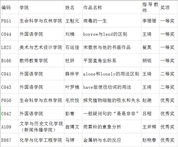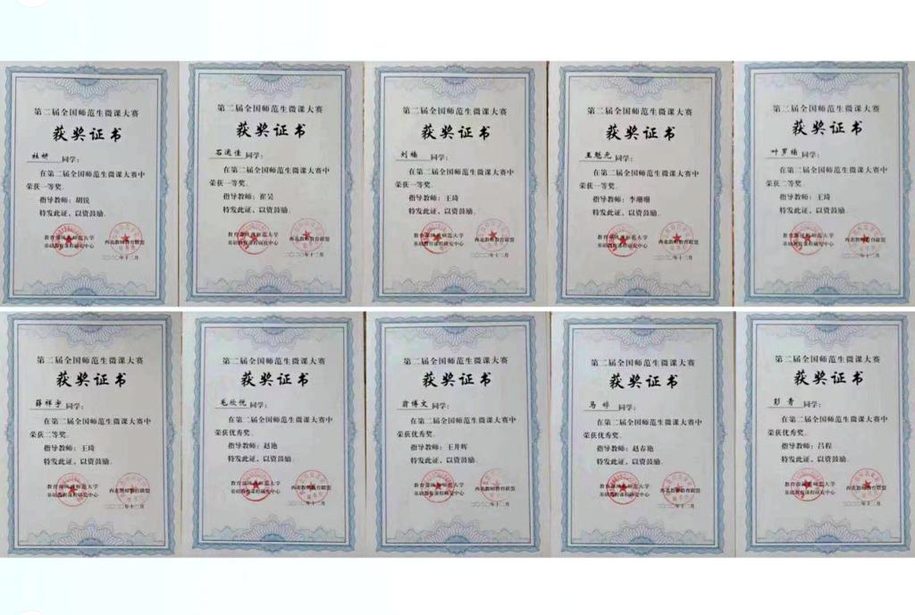为加快我校师范类学生教学综合能力培养,推进高素质教师队伍建设和精品课程建设,普及信息化教学手段,促进信息技术与教育的深度融合,探索微课在课堂教与学创新应用中的有效模式,促进优质教育资源共建共享,按照“全国第二届师范生微课大赛”组委会要求,我校经过严格评审,遴选优秀微课作品参加了全国第二届师范生微课大赛决赛,近日决赛成绩公布,我校共有十名选手脱颖而出,其中四名学生荣获大赛一等奖,两名学生荣获大赛二等奖,四名学生荣获大赛优秀奖。具体获奖信息如下: