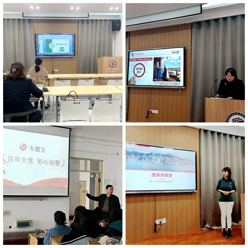2020年以来,马克思主义学院结合“三会一课”,开展了系列“四史”集中学习。以支委会设定议题讨论学,党员大会集中学,党小组研讨学,先后就党的成立、两个历史决议、新中国史、改革开放史进行专题培训学习。通过讲党史故事追忆峥嵘岁月,叙新中国史歌颂伟大成就,谈改革开放史礼赞非凡业绩,研社会主义发展史理清时空脉络。以教师先学先会先行引导学生学会学懂学深。本学期,还在形势与政策课中设置了“百年大党 初心如磐”的专题,使党史学习教育在课程上做到专题化、理论化、系统化、长期化。
