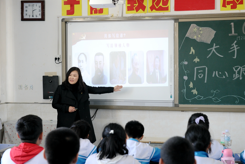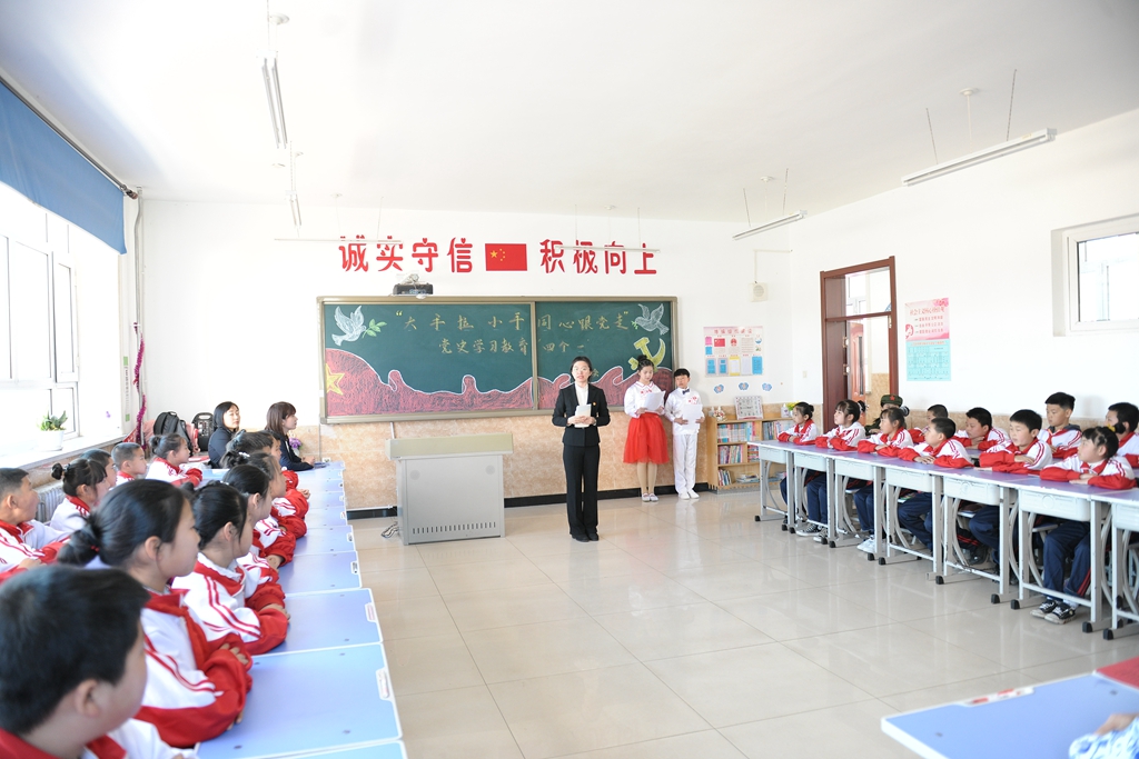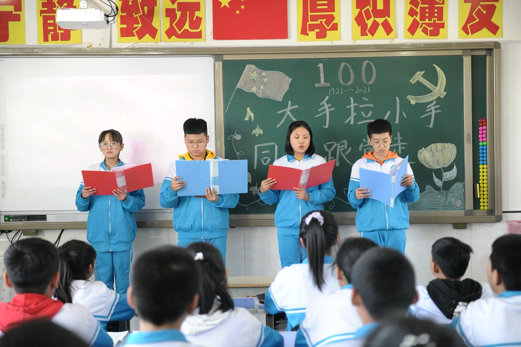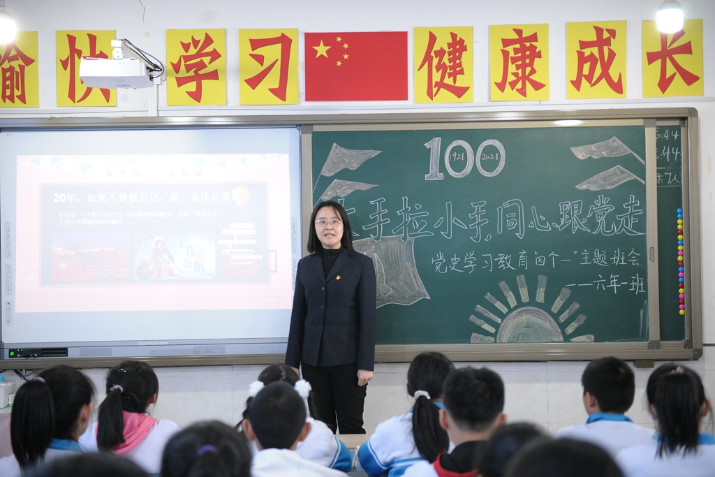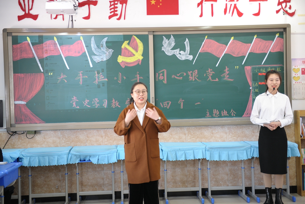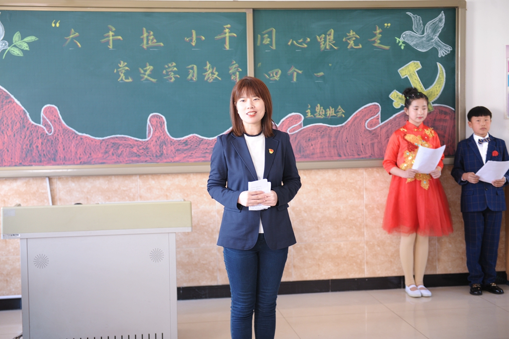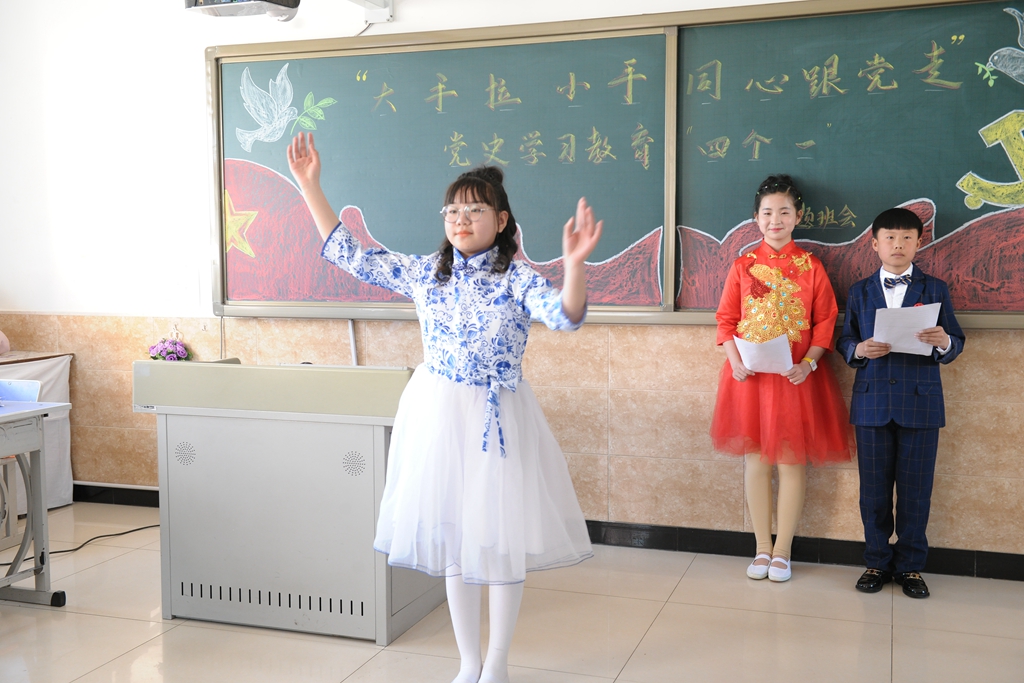 “大手拉小手,同心跟党走”党史学习教育“四个一”主题班会以符合中小学生年龄特点与认知经验为前提,采用寓教于乐的多样体验,设计了四个“一”的主题:演唱一支党的赞歌——各班同学们合唱了《没有共产党就没有新中国》《闪闪红星》《中国少年先锋队队歌》《少年心中国梦》等歌曲,大家以气势磅礴、铿锵有力的歌声抒发对党、对祖国的热爱;讲述一个党的故事——青年教师讲述了《一生正气,一门正义夏明翰的故事》《肖永正的故事》《半条被子》《周恩来的故事》等党史中的经典故事,六合中心校的同学们讲述了《王二小的故事》《叶挺的故事》《抗日小英雄海娃的故事》《过年》等党史故事,师生们在一个个党史故事中一起追寻红色记忆,感受中国共产党成长壮大的曲折历程;朗诵一首党的诗歌——青年教师和同学们一起朗诵了经典诗歌《亲爱的祖国》《百年辉煌》《党的赞歌》《党啊,我亲爱的党!》,将红色种子厚植在学生心田,让红色基因在这里传承发扬;写一封给党的书信——在青年教师的引导下,全体学生以“纸”为媒,给党写了一封书信,对象有的是英雄烈士,有的是领袖人物,部分同学还朗读了书信,表达了同学们对党的热爱和对美好未来的憧憬之情。