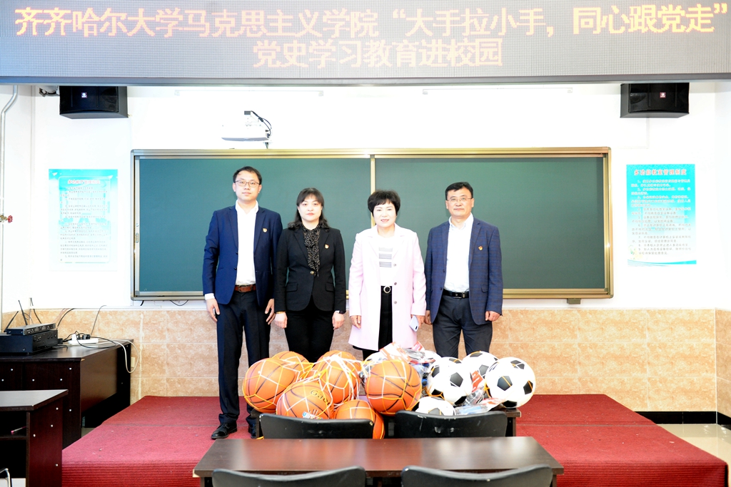 主题班会召开前,青年教师读书会的教师们向六合中心学校的同学们捐赠了球、跳绳等文化活动用品,向同学们传达了来自齐齐哈尔大学马克思主义学院的各位青年教师的关心和温暖。
