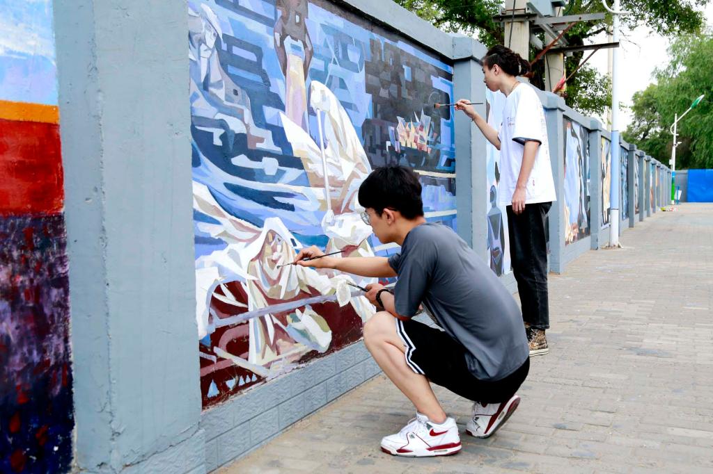 百米党史彩绘墙是由美术与艺术设计学院120余名师生创作完成的。在进场创作前,学院党委带领专业师生进行了一个多月的设计研讨,6月21日开始进场创作,百余名师生顶着炎炎烈日连续工作三天,终于将这浓缩了党百年奋进历程的靓丽彩绘呈现在了大家面前。