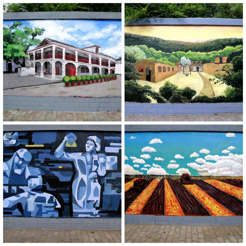 彩绘墙以“红、蓝、黄、绿”四种颜色把墙面分成四个主题集中表现党领导人民百年来波澜壮阔的奋斗史。红色表现了中国共产党筚路蓝缕奠基立业的发展历程、蓝色表现了新中国攻坚克难如火如荼的工业建设进程、黄色表现了改革开放粮食丰收乡村振兴事业的稳步推进历程、绿色表现了低碳环保的生态文明建设日新月异的奋斗进程。