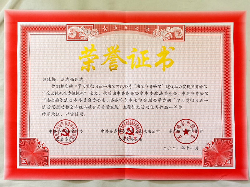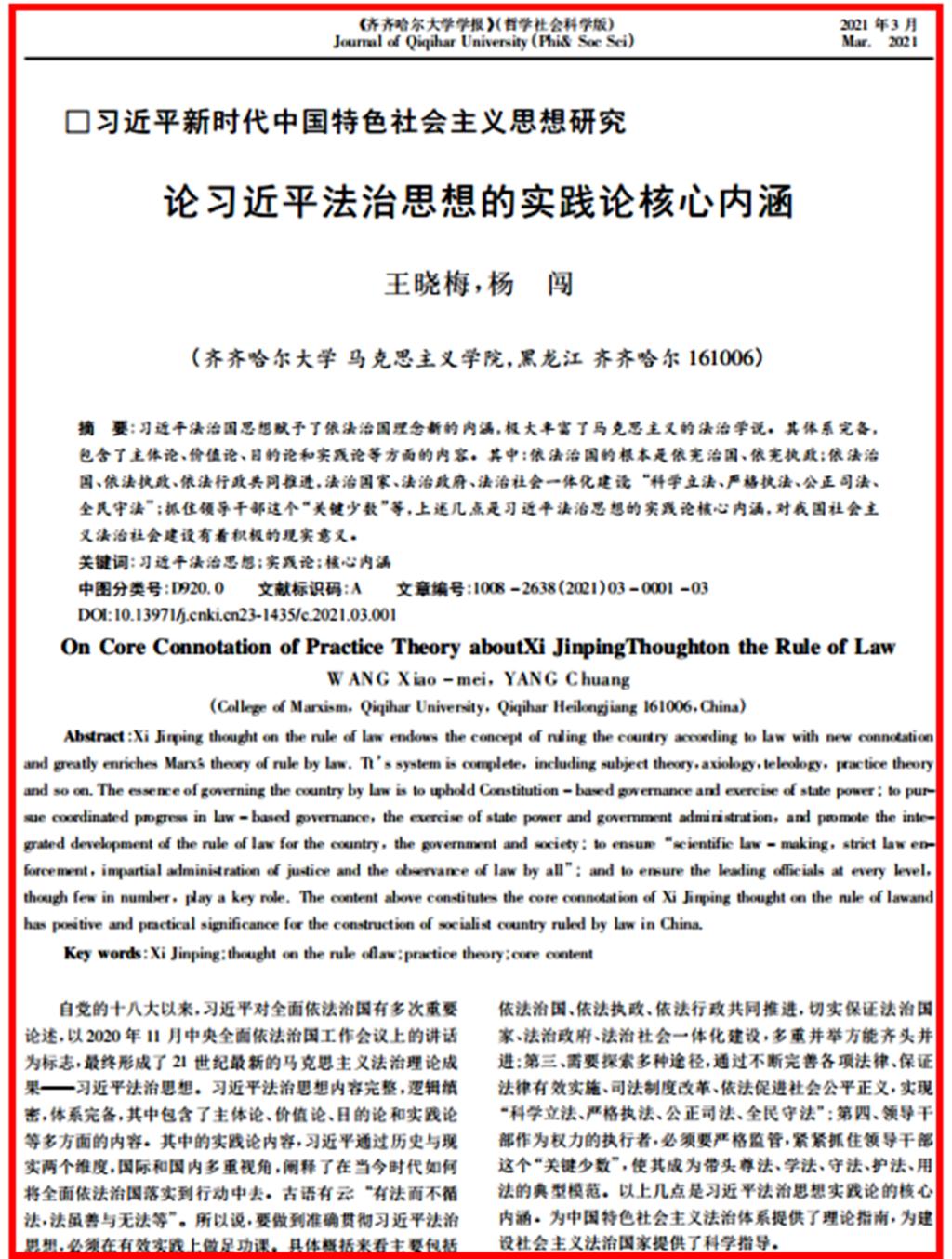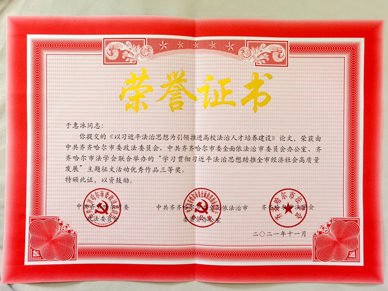 学思践悟,细照笃行。学校党委高度重视学习宣传贯彻习近平法治思想。习近平法治思想是马克思主义法治理论同中国实际相结合的最新成果,是21世纪马克思主义法治思想,是习近平新时代中国特色社会主义思想的重要组成部分,是全面依法治国的根本遵循和行动指南,深刻回答了为什么要全面依法治国、怎样全面依法治国这个重大时代课题。校、院两级党委将习近平法治思想的学习纳入党委理论学习中心组学习计划、纳入教职工政治理论学习计划,组织广大师生员工充分利用“学习强国”“黑龙江教育干部网络学院”等网络平台等多种形式,学深悟透习近平法治思想,深刻领会其重大意义、精神实质、实践要求,学懂弄通《法治中国建设规划(2020—2025年)》把习近平法治思想融入教学体系。自2021年9月开始,将“习近平法治思想概论”纳入了2021级法学专业基础必修课,做好进教材、进课堂、进头脑工作。加强习近平法治思想的理论研究和阐释,发表《论习近平法治思想的实践论核心内涵》等论文;在齐齐哈尔市“学习贯彻习近平法治思想”主题征文活动中,我校师生荣获一等奖、三等奖各1篇。推动习近平法治思想入脑入心、走深走实,不断增强法治意识,提高法治能力水平。
