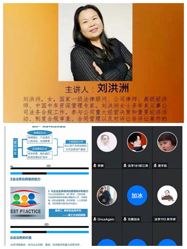 10月20日,法学专业举办的“运用法治思维彰显法务价值——企业经营活动中法务实践”线上专题讲座。刘洪洲女士理论联系实际,为法学专业师生展现了作为一个大企业的法律顾问需要具有整体思维和多维度解决问题的能力。