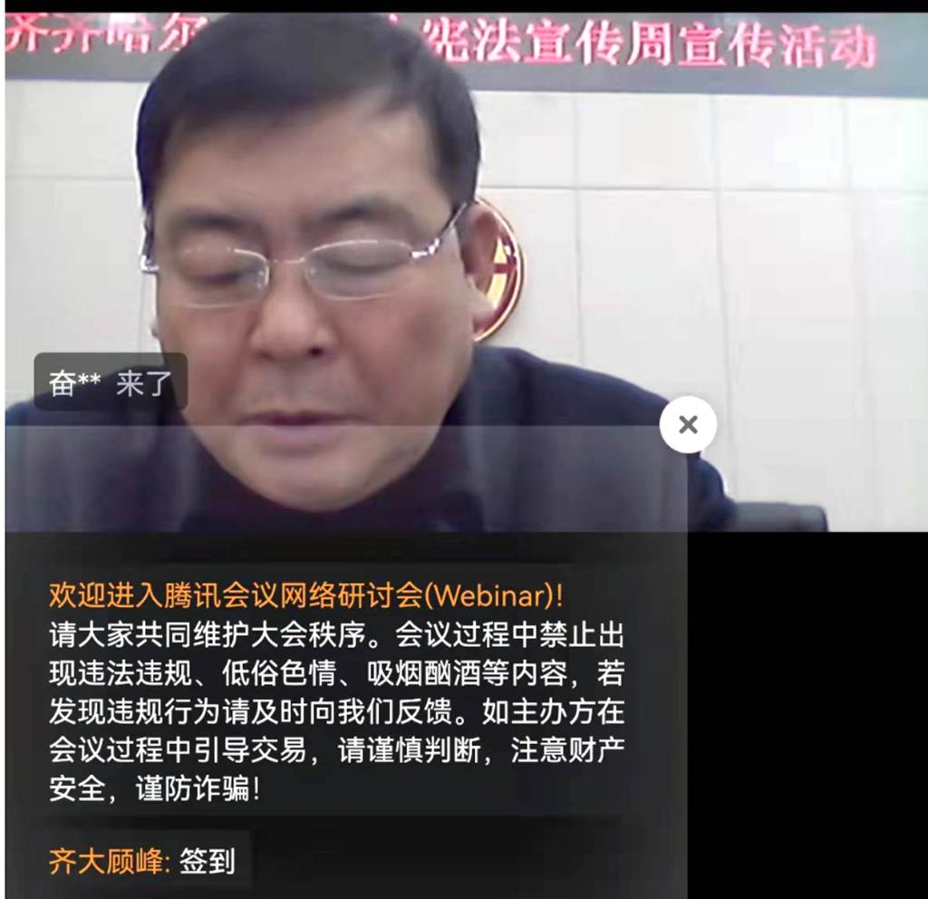12月3日,校工会组织全体教职工在线上参加宪法大讲堂活动,聆听齐齐哈尔市委党校法学教研部王宇教授解读习近平法治思想。