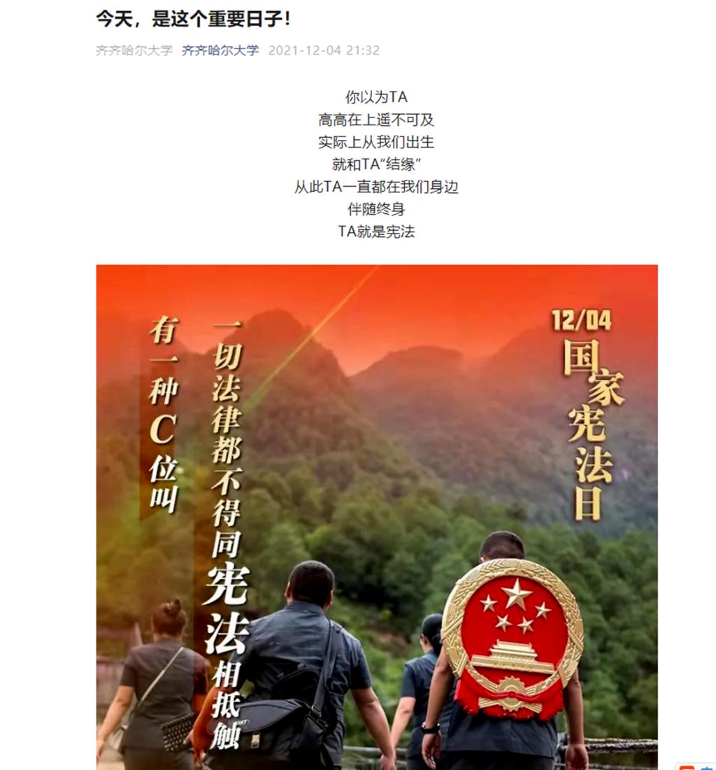 在第八个国家宪法日,教育部举办了教育系统的“宪法晨读”活动,各单位各部门积极组织学生参与,一起诵读宪法部分条款,观看“学宪法 讲宪法活动全国总决赛颁布获奖名单及部分优秀学生的现场展演。共同学习宪法知识,体会宪法温度,感受宪法力量。