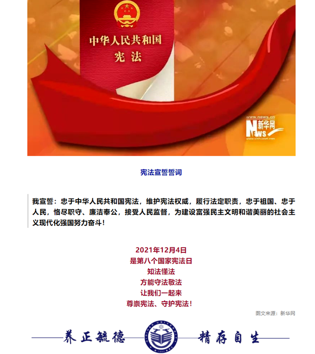 治国凭圭臬,安邦靠准绳。法律权威源自人民的内心拥护和真诚信仰,加强宪法学习宣传教育是实施宪法的重要基础。我校各基层党委、直属党支部迅速行动、积极部署,围绕习近平法治思想,特别是总书记关于宪法的重要论述;党的十九届六中全会精神;中华人民共和国宪法;社会主义核心价值观;中华人民共和国民法典;疫情防控相关法律法规开展了教师、学生各层面的学习活动,掀起学习热潮。