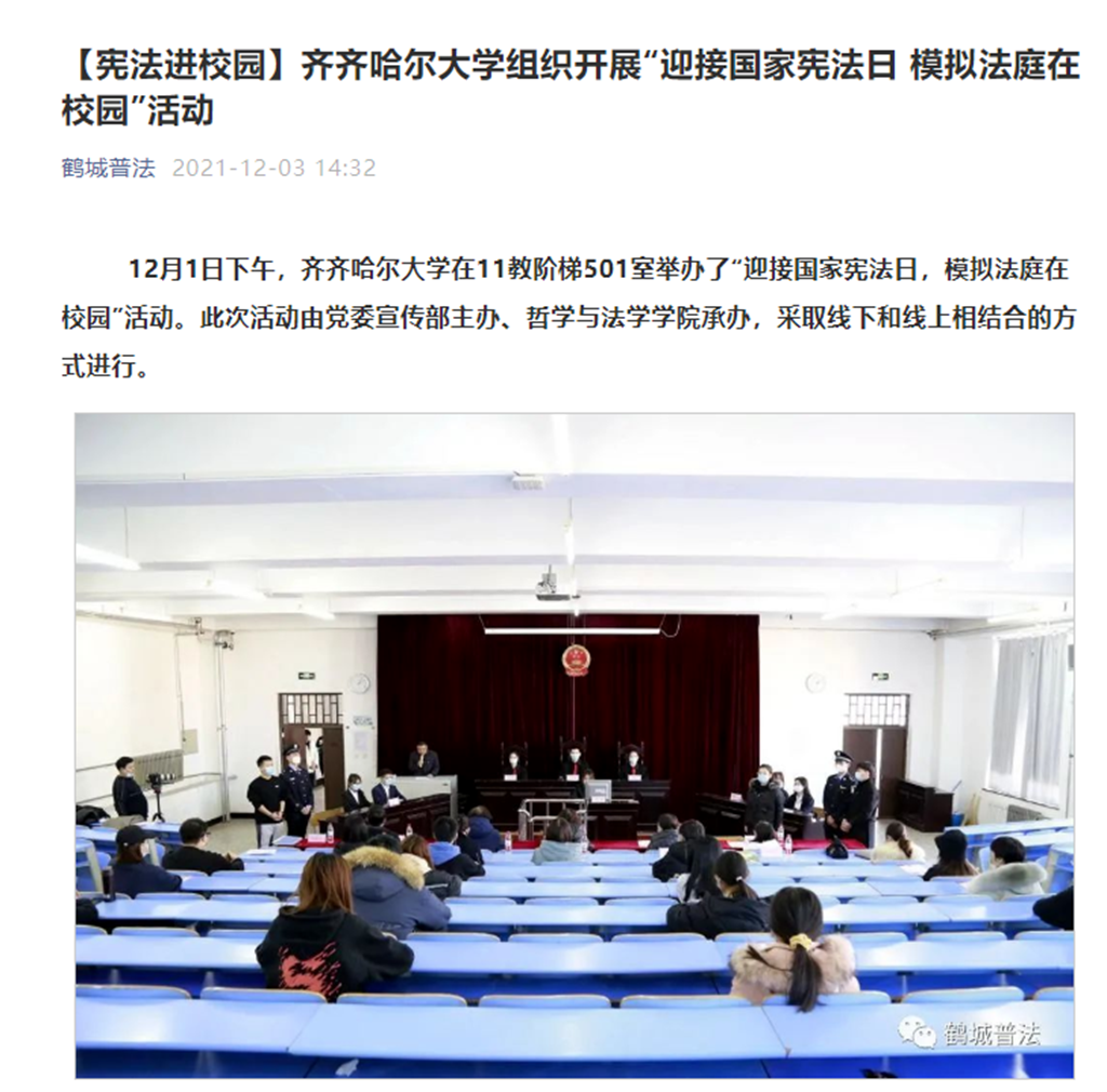 久久为功,驰而不息。坚持不懈开展“模拟法庭”实践活动是我校特色鲜明的常态化法治宣传教育活动。哲学与法学学院利用法学学科专业优势,结合教学内容,不断总结经验,持续打造“模拟法庭”精品活动,在学校法治宣传教育活动中发挥了典型示范的作用。12月1日,校党委副书记齐宏伟,校党委常委、宣传部长王晓梅,哲学与法学学院党委书记于春梅,宣传部副部长何强,哲学与法学学院副院长苗绘等与师生代表一起参加了以真实案例改编的“帮助信息网络犯罪案”的模拟法庭庭审活动。以线下和线上相结合的方式,以案说法全程直播,在严密的法律程序和庄重严肃的法庭气氛中,让师生身临其境感受法治权威。融专业性、知识性、教育性、警示性为一体,提高学生法治意识,增强法治观念引导学生知法明理。12月3日,齐齐哈尔市司法局“鹤城普法”微信公众号作了报道。