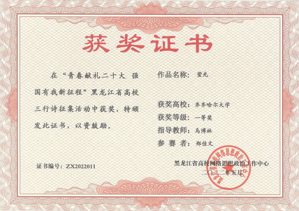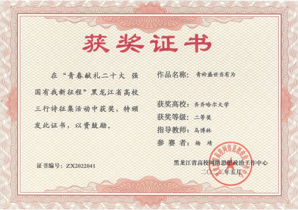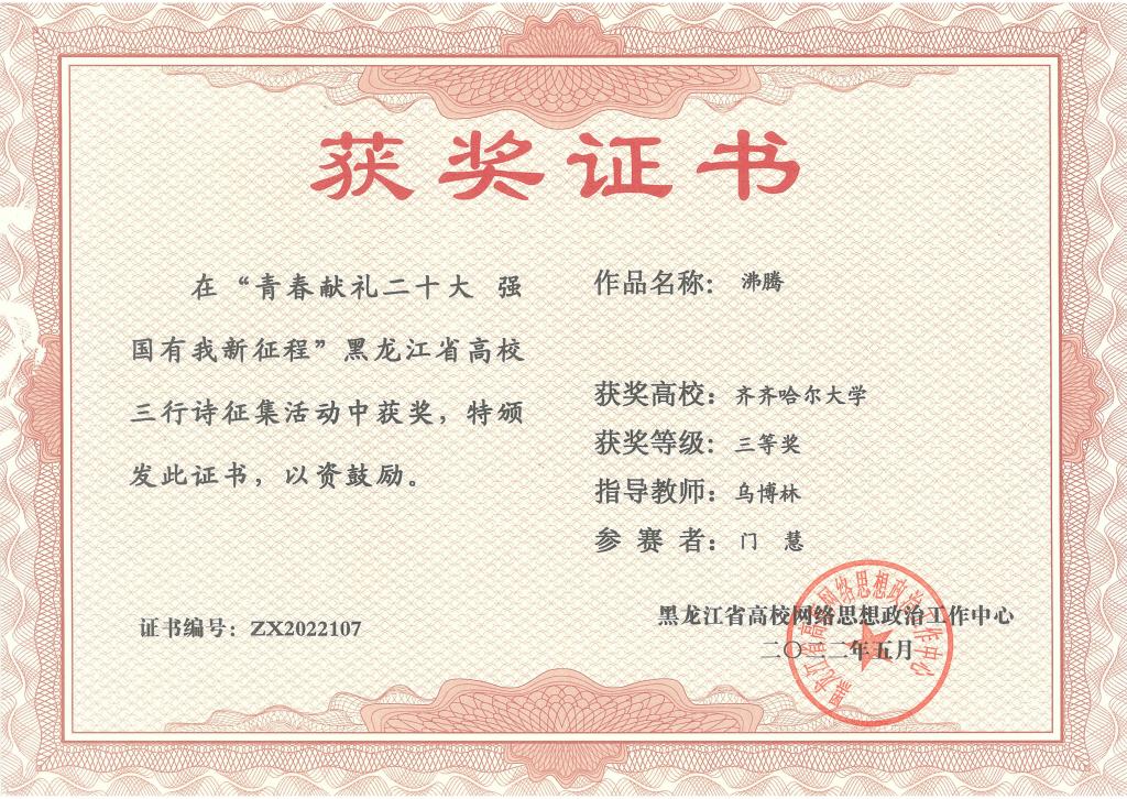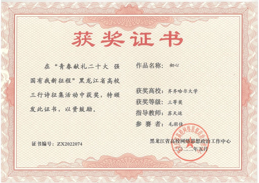 日前,黑龙江省高校网络思想政治工作中心下发了《关于开展“青春献礼二十大 强国有我新征程”全省高校三行诗征集活动的通知》,校党委宣传部按照通知要求广泛宣传,积极组织学生以三行诗的形式表达爱国之情和青春之志,共征集优秀三行诗作品200余首,经过学校评审,择优上报了10首优秀三行诗作品。