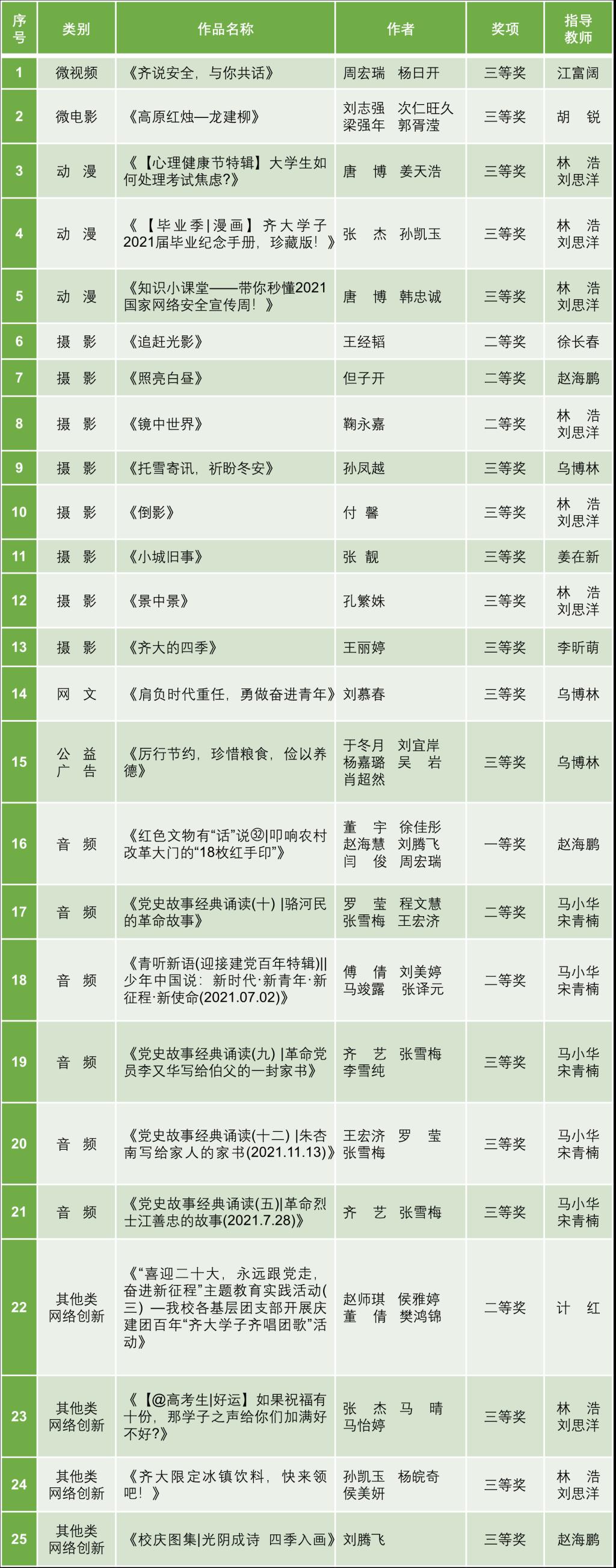 我校25项作品在第六届“全省大学生网络文化节”获奖,分别是一等奖1项,二等奖6项,三等奖18项。其中,由播主202董宇、制药201徐佳彤、工管202赵海慧、环艺201刘腾飞、计应202闫俊、机械201周宏瑞等六名同学录制的音频作品《红色文物有话说丨扣响农村改革大门的“18枚红手印”》获全省一等奖;由宣传部郭超、李昕萌老师提交的作品《听红歌· 学党史:探索新媒体时代高校思想政治教育新形势》获得“全省高校网络教育优秀作品推选展示活动”优秀工作案例二等奖。获奖作品数量和质量较前几届均有新的突破,充分展现我校在繁荣网络文化、推进高校网络思政育人工作上取得的成效。
