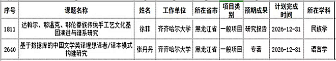 日前,全国哲学社会科学工作办公室发布2022年国家社会科学基金年度项目和青年项目评审结果,我校美术与艺术设计学院徐菲老师申报的《达斡尔、鄂温克、鄂伦春族传统手工艺文化基因演进与谱系研究》和外国语学院张丹丹老师申报的《基于数据库的中国文学英译理想译者/译本模式构建研究》获批国家社科基金一般项目,这是张丹丹老师第二次获批国家社科基金项目。目前,外国语学院已获批3项国家社科基金项目,美术与艺术设计学院已获批2项国家社科基金项目。