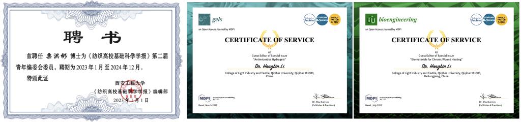 栗洪彬的研究方向主要集中于纺织基生物医用纺织品的设计,依托黑龙江省工业大麻及制品质量监督检验中心、寒区麻及制品教育工程研究中心以及“汉麻精深加工及检测关键技术”省优势特色学科等平台,取得了丰硕成果。作为哈佛大学哈佛医学院的联培生,栗洪彬发现,顶级学府的魅力不仅在于在学生心中厚植追求卓越的理念,也在于给有准备的人提供更多的机会,哈佛的经历给栗洪彬的科研能力带来了质的提升,开发的纸基器官芯片实现了多孔血管化肿瘤模型的构建并用于抗癌药物的筛选,为构建低成本的组织模型提供了一个新平台。2017年以来,他先后承担了黑龙江省自然科学基金、黑龙江省高等学校青年创新人才项目等10余项,近五年以第一作者/通讯作者在Aggregate、AdvancedFiberMaterials、ChemicalEngineeringJournal、NanoLetters、Biofabrication等国际高水平期刊发表SCI论文24篇(ESI高被引1篇,Cell子刊1篇,中国科学院一区10篇,IF>10的6篇),授权中国发明专利2项,主编教材1部、Springer出版社英文专著1章。他还被西安工程大学《纺织高校基础科学学报》聘为青年编委,被国际期刊Gels和Bioengineering聘为客座编辑。此外,栗洪彬与哈佛大学、新加坡国立大学、哈尔滨工业大学、上海交通大学、同济大学、深圳大学和东北农业大学保持着良好的合作关系,指导的学生中两人分别于2022年和2023年赴同济大学和东北农业大学攻读博士学位。