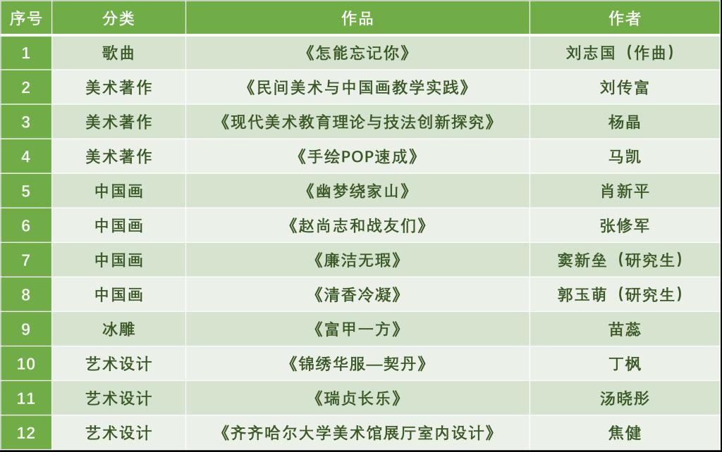 日前,齐齐哈尔市文学艺术界联合会对第六届齐齐哈尔文艺奖获奖名单进行了公示。我校5名教师及14件文艺作品获奖。具体名单如下: