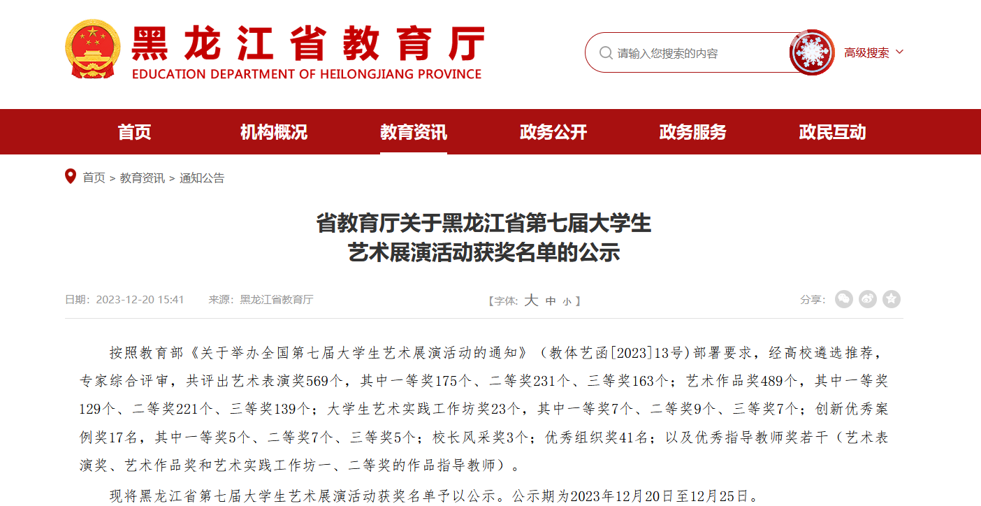 近日,由黑龙江省教育厅主办的全省第七届大学生艺术展演活动评选结果揭晓。我校参赛项目成绩优异,共上报参赛作品68项,获奖63项,其中一等奖29项,二等奖25项、三等奖9项,获奖数量、层次均有新突破,是我校文化育人实践成果的生动体现。