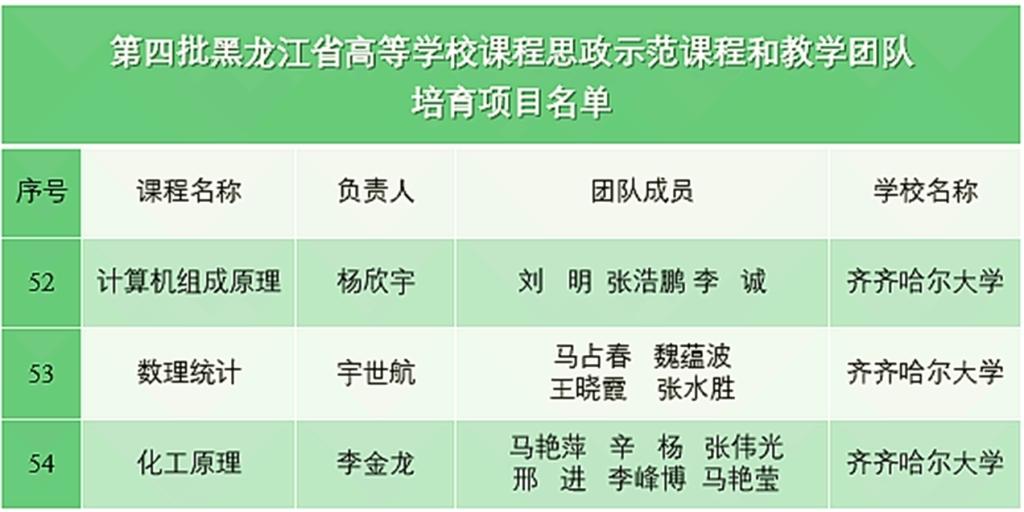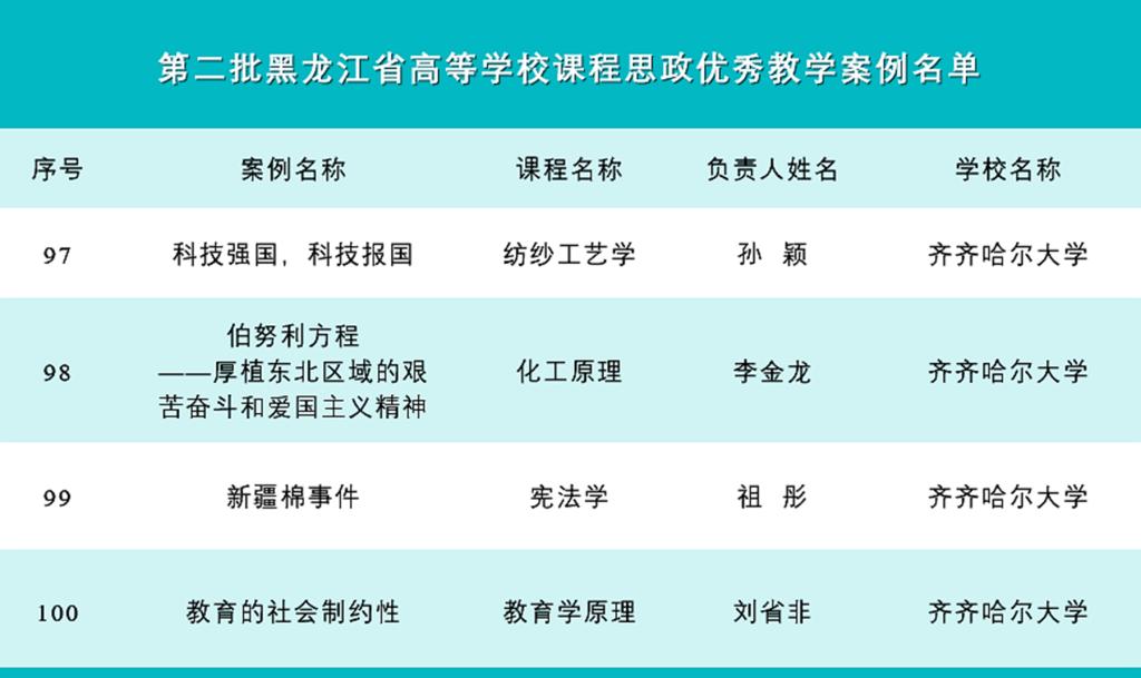 近日,黑龙江省教育厅公布黑龙江省高等学校第四批课程思政示范课程和教学团队培育项目和第二批课程思政优秀教学案例名单。齐齐哈尔大学3门本科课程入选第四批黑龙江省高等学校课程思政示范课程和教学团队培育项目,4个教学案例获批第二批黑龙江省高等学校课程思政优秀教学案例。截至目前,学校共获批省级课程思政示范项目12项,省级课程思政优秀教学案例8个,在省属同类院校中居于前列。