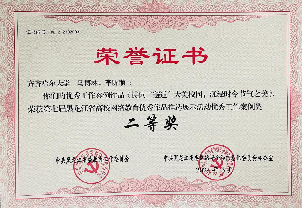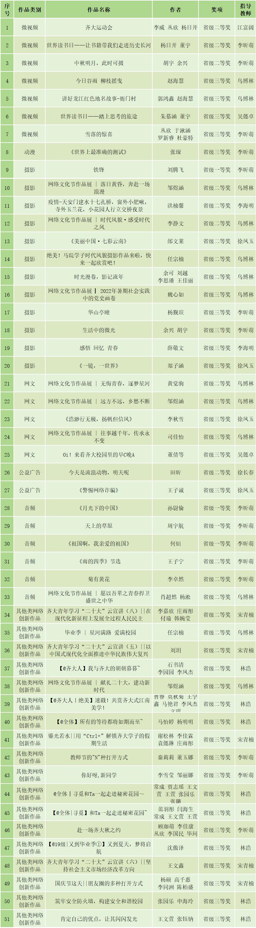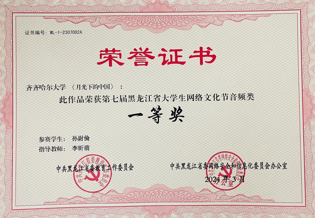 我校52项作品在第七届“全省大学生网络文化节”获奖,分别是一等奖4项,二等奖20项,三等奖27项。其中,环艺201刘腾飞同学的《铁锋》获全省摄影类作品一等奖,朝鲜语231班孙尉倫同学的《月光下的中国》、播主222班周宇航同学的《天上的草原》、音乐表演232班何烜同学的《祖国啊,我亲爱的祖国》分别获得全省音频类作品一等奖;由乌博林、李昕萌老师提交的作品《诗词“邂逅”大美校园,沉浸时令节气之美》获得“全省高校网络教育优秀作品推选展示活动”优秀工作案例二等奖。本次获奖作品数量和质量均有新的突破,充分展现我校在繁荣网络文化、推进高校网络思政育人工作上取得的成效。
