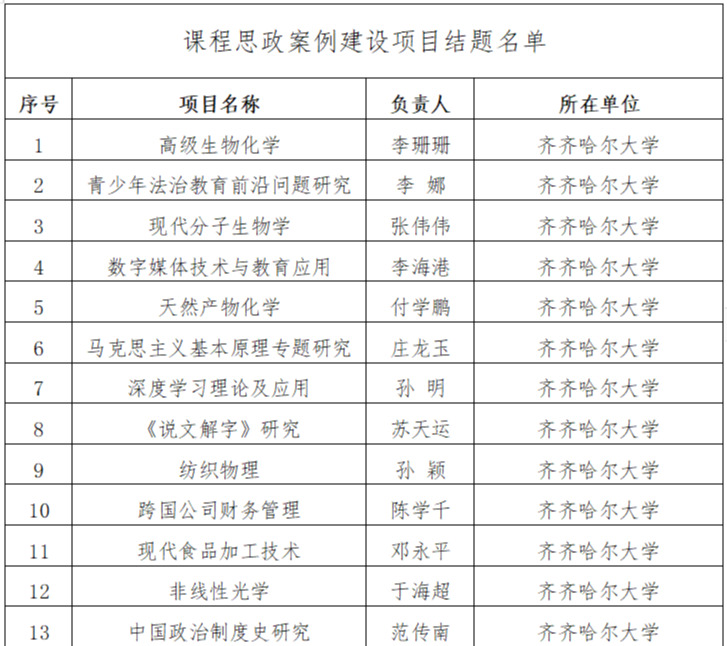 近日,黑龙江省教育厅下发了《关于公布2023 年度黑龙江省研究生课程思政建设项目结题名单的通知》(黑教研函〔2024〕48号)。我校共有15个项目通过结题验收。