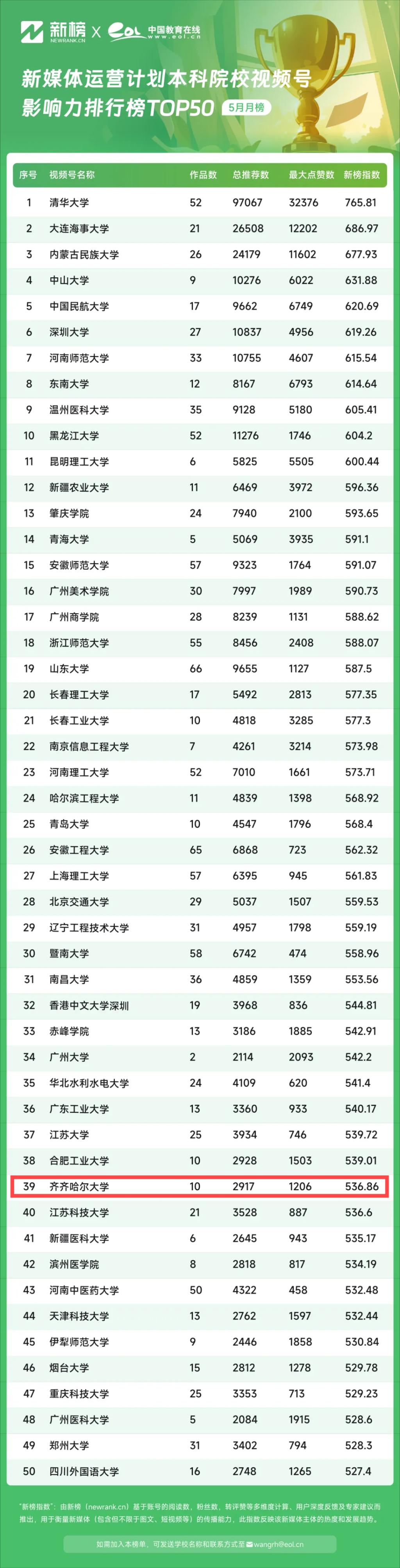 近日,中国教育在线联合国内权威新媒体评估机构--新榜,对中国教育在线新媒体运营提升计划联盟高校的新媒体数据进行盘点,制作了首期高校新媒体运营TOP50榜单。在5月的中国教育在线新媒体运营计划本科院校微信公众号影响力排行榜TOP50中,“齐齐哈尔大学”官方视频号位列第39位。