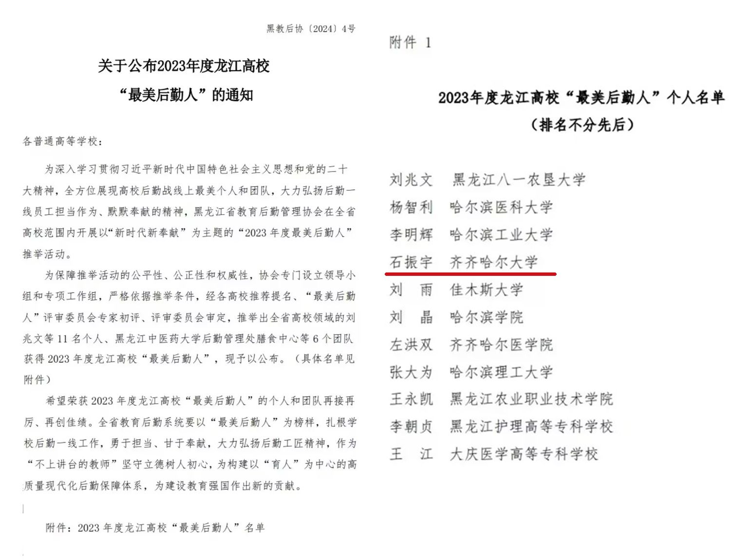 日前,黑龙江省教育后勤管理协会下发了《关于公布2023年度龙江高校“最美后勤人”的通知》,我校教师石振宇获得2023年度龙江高校“最美后勤人”称号。
