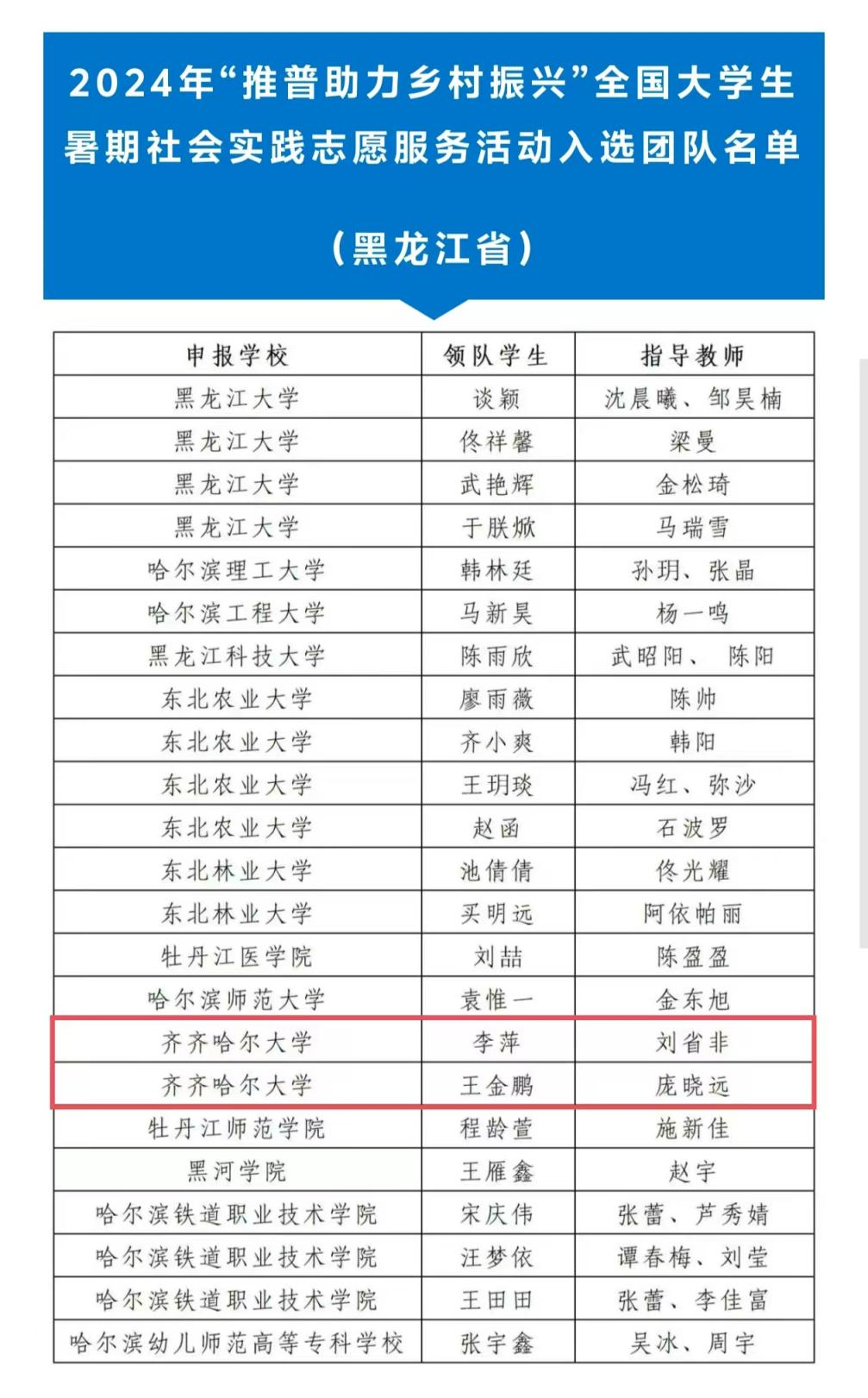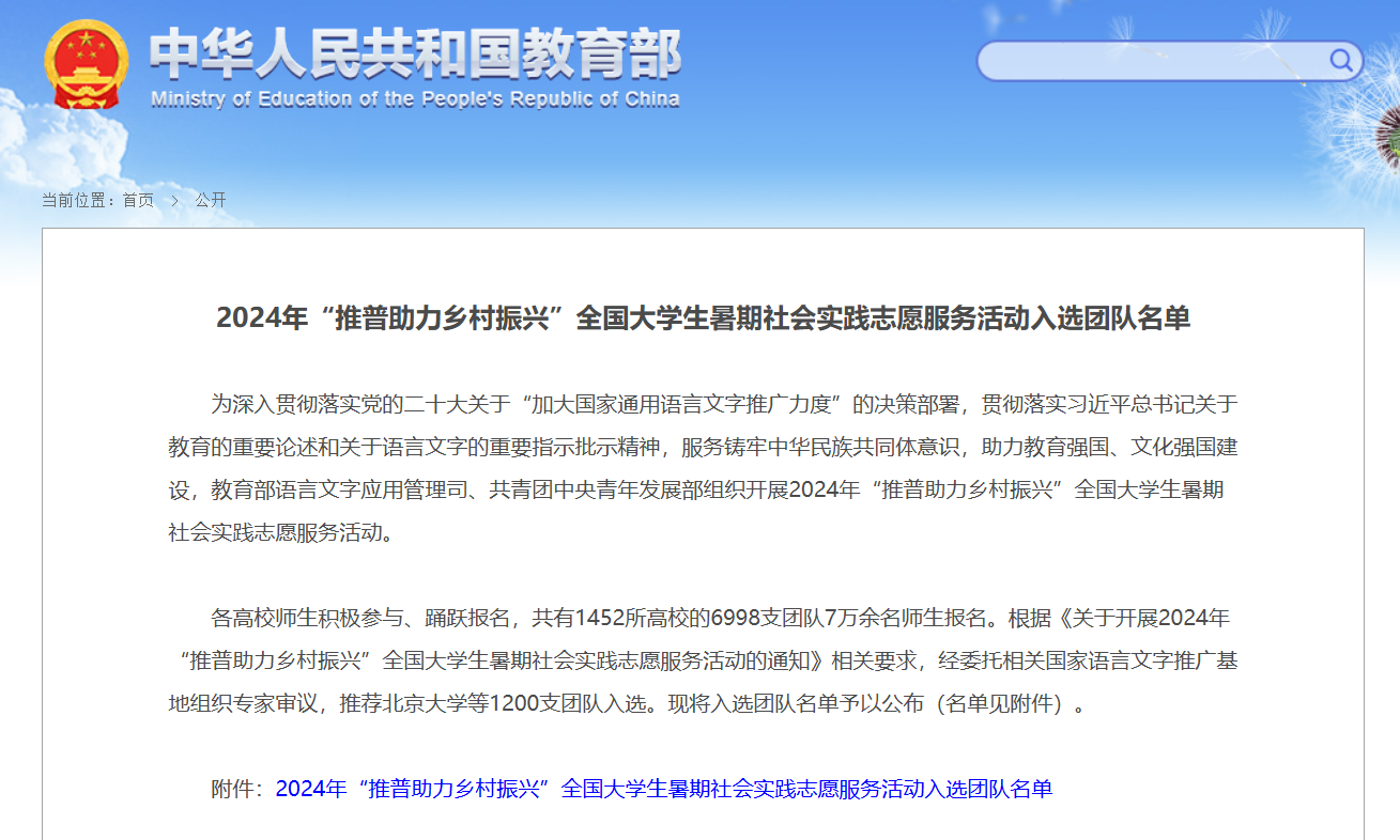 近日,教育部网站公布2024年“推普助力乡村振兴”全国大学生暑期社会实践志愿服务活动入选团队名单。经委托相关国家语言文字推广基地组织专家审议,推荐1200支团队入选,黑龙江23支团队上榜,其中我校出彩龙江志愿服务队、研究生志愿服务队两支团队从全国1452所高校的6998支团队中脱颖而出,成功入选,评选结果被学习强国等平台转载。