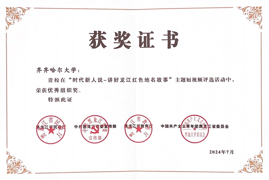 为深入学习宣传贯彻党的二十大精神,持续巩固拓展主题教育成果,加大龙江地名文化宣传力度,深入挖掘地名档案资源价值,由省民政厅、省委宣传部、省教育厅、团省委联合主办,黑龙江日报报业集团、省民政资料档案馆共同协办的“时代新人说——讲好龙江红色地名故事”主题短视频征集宣传展示活动在去年7月火热启动。活动发布以来,全校师生积极参与,讲述龙江地名故事,传承红色基因。经活动组委会初筛海选,我校共入选3个作品,最终荣获优秀组织奖。