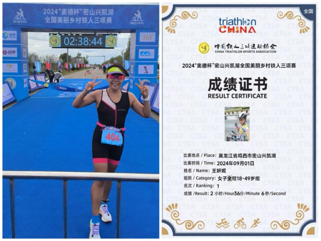 9月1日,2024“奥德杯”密山兴凯湖全国美丽乡村铁人三项赛激情开赛,我校体育学院教师王妍妮获得女子全程18-49岁组冠军,并获得大众全程组健将级别荣誉。