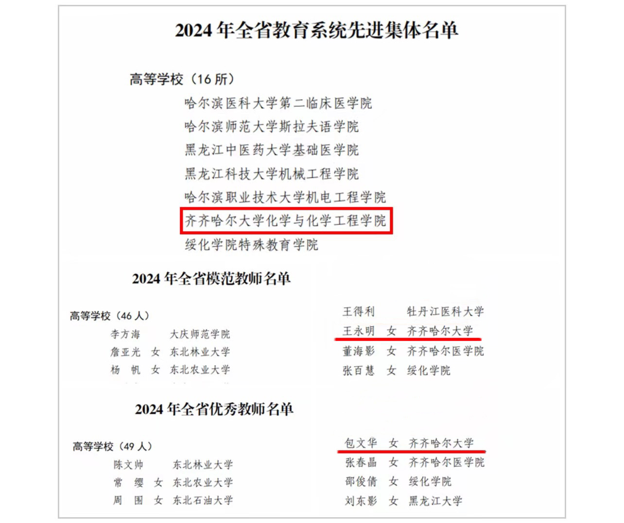 近日,省人力资源社会保障厅、省教育厅公布了2024年全省教育系统先进集体和先进个人拟表彰对象,我校化学与化学工程学院荣获“2024年度全省教育系统先进集体”荣誉称号,马克思主义学院王永明教授荣获“2024年全省模范教师”荣誉称号,音乐与舞蹈学院包文华教授荣获“2024年全省优秀教师”荣誉称号。