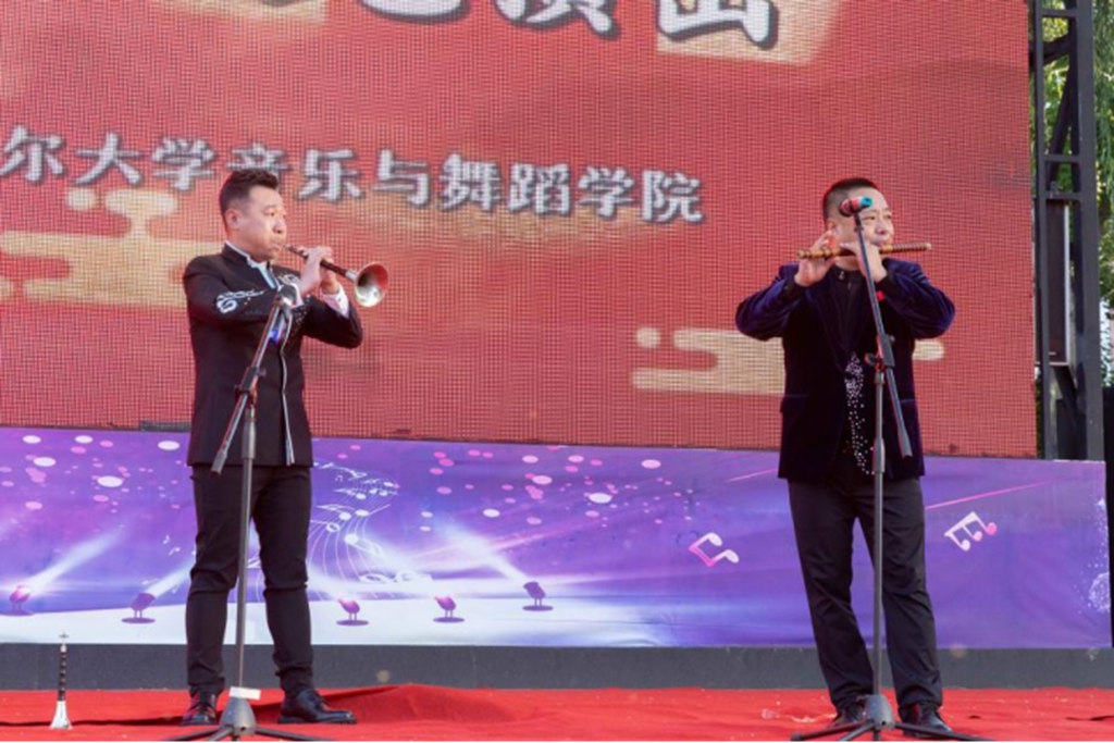 管弦乐合奏《单簧管波尔卡》旋律流畅、轻松活泼,充满了节奏感,喜悦之情随着乐曲流淌;唢呐与笛子合奏《长白山歌》以唢呐的嘹亮与笛子的悠扬相互交织,以乐曲为画笔,为观众描绘出长白山巍峨的山峰、茂密的森林和奔腾的溪流,壮丽景色令人心驰神往。古筝合奏《盛世国乐》音色清脆悦耳,旋律激昂澎湃,以恢弘的乐章述说东方情怀,展现大国风范。