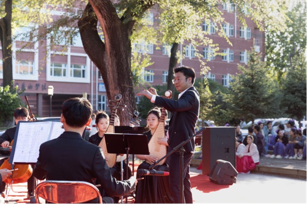 夕阳余晖中,一曲简洁明亮、清新悠扬的民乐合奏《花好月圆》拉开了文艺演出的帷幕,随后曲调热烈的乐曲《步步高》激昂奏响,欢快的节奏让傍晚的校园拉满节日的“氛围感”。