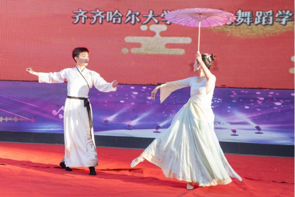 双人舞《汉宫对影》动作优美流畅,时而轻盈如燕,时而刚劲有力,将汉宫的神秘与优雅展现得淋漓尽致,令人惊艳;《伞缘》的两位舞者手持油纸伞,用灵动的身姿轻歌曼舞,演绎出一段浪漫唯美的故事,动作行云流水,如诗如画。傣族舞蹈《水韵》的舞者们身姿婀娜,整齐划一,展现了傣族舞蹈的独特韵味和傣族水乡的宁静与美丽。