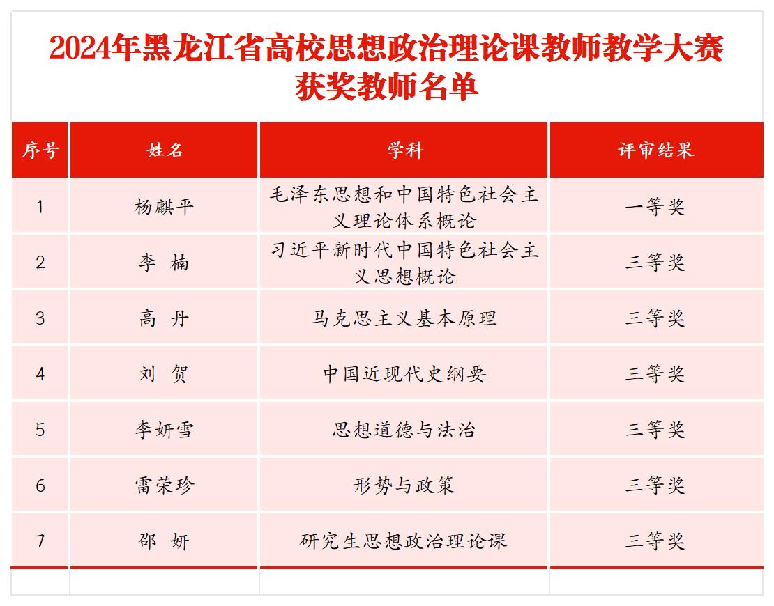 近日,黑龙江省教育厅与省教科文卫体工会委员会下发了《关于公布2024年黑龙江省高校思想政治理论课教师教学大赛获奖名单的通知》,我校马克思主义学院教师杨麒平获一等奖,李楠、高丹、刘贺、李妍雪、雷荣珍、邵妍获三等奖。