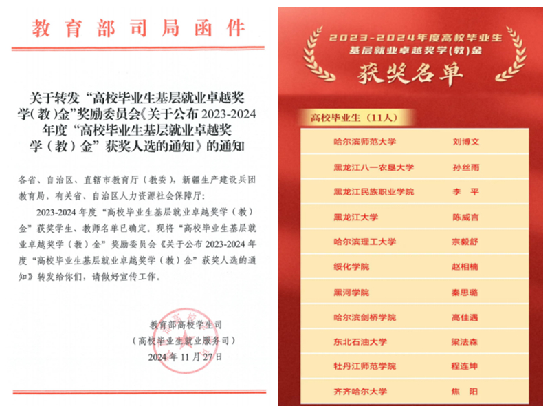 近日,教育部公布2023—2024年度“高校毕业生基层就业卓越奖学(教)金”获奖人选名单,黑龙江省11名学生上榜,我校毕业生焦阳同学位列其中。